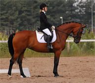 LuonnekuvausRaakku on yleisesti ottaen miellyttämishaluinen ja muutenkin mukava hevonen - Liekö toisaalta mikään ihme, kun sen sekä isä että äiti ovat myös hyväluonteisia, ja tammaa on pidetty pienestä pitäen kuin kukkaa kämmenellä? Vaikka Raakulle ei tulisi mieleenkään alkaa yhtäkkiä himoamaan ihmislihaa tai verikylpyjä, voi se tammoille tyypillisinä, silloin tällöin kohdalleen osuvina känkkäränkkäpäivinään esitellä kipakampaa pimeää puoltaan; Ja niin tämä Käytöksen Kultaisen Kirjan kalloonsa kaivertanut hyväkäytöksinen neiti voi muuttua silmänräpäyksessä Saatanan kätyriksi - Mutta vain muutamaksi päiväksi. Hyvinä päivinään (ah, 80 % vuoden kaikista päivistä <3) Raakku sopii hyvin kaveriksi ja hoidettavaksi jokaiselle hevosista vähääkään kiinnostuneelle, eikä siitä ratsastaessakaan löydy mitään vikaa - Päinvastoin, Raakku on tallimme tämän hetkisiä parhaita ratsuja!Raakun hoitaminen sujuu yleensä todella helposti - Se seisoo kiltisti paikallaan, ei säiky, eikä kavahda hoitajan kummallisiakaan päähänpistoja. (Kerrankin yksi pikkutyttö toi tamman viereen kottikärryt ja kiipesi niihin seisomaan, kun ei muutoin ylettänyt selkää harjaamaan..) Tamma on tottunut myös, pikkulasten hoidokkina ollessaan, sietämään äkkinäisiä liikkeitä, mutta kovaa melua Raakku ei voi karsinassaan sietää. Sen omassa (tallin toisiksi suurimmassa, kyllä tamma vaalii omia tarpeitaan sitten niin tarkasti, jos sille päälle sattuu…) karsinassa tulee käyttäytyä korrektisti, eivätkä huuto tai muu turha meluaminen mahdu tamman sietokyvyn sisäpuolelle. Kun volyymia muistetaan kääntää pienemmälle, sujuu itse harjaus usein hyvin näppärästi: Hevonen seisoo siinä, missä annat sen seistä, liikahtamatta ja sinä harjaat sitä keskeytyksettä. Raakku pitää harjauksesta, varsinkin hiukan kovemmista harjoista ja kumisuasta, mutta liian kovaa jynssäämistä ja rajuja otteita tulee välttää. Kun tamman korvat putoavat lerpalleen lehmämäisesti pään sivuille, voit olla varma, että se on täysin rentona: Vaikka Raakku näyttääkin silloin lähinnä ikävystyneeltä kuin iloiselta, on korvien lerputtaminen sen merkki kertoa olevansa tyytyväinen oloonsa. Kaviot tamma nostaa kiltisti, vaikka kesällä ulkona harjatessa takajalkojenputsaajan riesana onkin varmasti tamman silmille vispaava häntä. Ratsastaessa Raakku on koulutustasolleen ja kapasiteetilleen uskollinen - Pelkkää unelmaa! Se on varma, pehmeä, voimakas, nöyrä ja yritteliäs, vaikka rakenteeltaan se onkin melko hintelä ja lihaksettoman näköinen: Tosin mielipide tulee muuttumaan, kun näet tamman askeltavan vahvasti ja varmasti syvälle runkonsa alle. Tammalla on myös alkutunnista lähtien aina mukava ja innokas halu liikkua eteenpäin; Parempi vaan ratsastajan nauttia tamman kyydistä ja asettaa sille tehtäviä mielenvirkistykseksi, ratsastaa istunnalla ja pehmeällä kädellä, kuin paukuttaa pohkeillaan tamman herkkiä kylkiä - Kannuksia tammalla käytetään vain kilpailuissa, ja sinnekin pyritään valitsemaan aina mahdollisimman lyhyet ja päistään pyöreät sellaiset. Kun se liikkuu jo valmiiksi itse eteen, mitäs sitä häiritsemään? Raakku hakee myös itse mielellään muotoon, ja se taipuu pehmeästi osaamattomammankin käsissä. Raakulla on isot, ilmavat ja liitävät - kouluhevoselle tyypilliset - askeleet, jotka ovat sivustakatsojan silmään todella vaikuttavia; Ja kyllä ratsastajakin tulee varmaksi siitä, että olisi aika alkaa totutella tamman suuriin askeliin, ellei halua viettää loppuelämäänsä seisaallaan. Tamman bravuureita ovat ehdottomasti lisäykset, ja se taitaa upean, ei kuitenkaan liian yliampuvan, jossa jalka ojentuisi luonnottoman suoraksi, showravin, jota se esittelee mielellään. Silloin tällöin tamma tahtoo kuitenkin pelkän "irrottelun" lisäksi keskittyä kunnolla, ja siltä luonnistuvat hienosti myös keskittymistä vaativat piruetit, sekä äärimmäiset kokoamiset passageen ja piaffeen - Tammalla on hyvä rytmitaju, ja tahti pysy usein hyvänä niin kootuissa askellajeissa, kuin laukanvaihdoissakin. Toki ratsastajakin joutuu tekemään töitä, ei se Raakku ihan tuosta vaan lähde suorittamaan grand prix-tason tehtäviä. Mutta kun tamman selkään löytyy sopivan rauhallinen ja järjestelmällinen ratsastaja, joka antaa tammalle paljon tilaa, mutta pitää sen myös kuuliaisena, on ratsukon menestys varmaa.